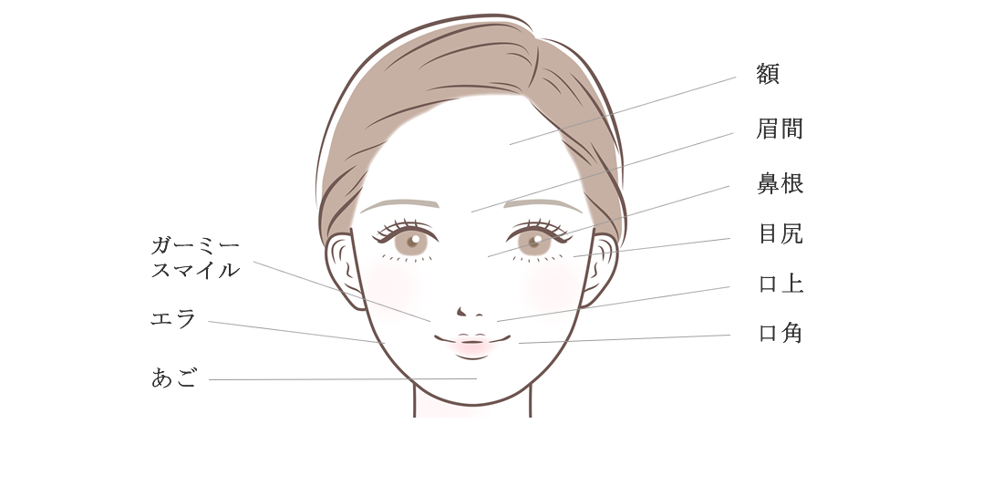目元・眉間・額・鼻根・あごなどに出来る表情ジワを改善します。シワを作る表情筋にボトックスを注射することで筋肉の過剰な動きを抑えることができシワを軽減します。定期的に治療を継続することで、将来的に刻まれていく表情ジワを予防することができます。