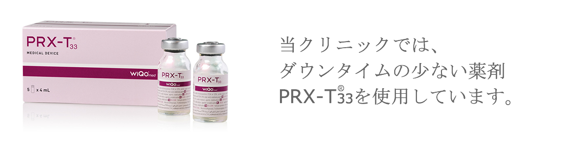 A:日頃からハイドロキノンやトレチノインを使っている方は、普通より皮膚が薄くなっており、PRX-T33の反応が強く出るかもしれません。よってPRX-T33を使う2週間前からハイドロキノン、トレチノインの使用を一旦止めていただくことをおすすめします。