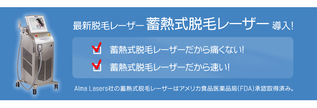 当院で採用しているAlma Lasers社の蓄熱式脱毛レーザーはアメリカ食品医薬品局(FDA)承認取得済みでThe Aesthetic Industry Award 2015の脱毛機器部門最高賞を受賞するなど海外でも広く支持されているメジャーブランド。 院長自ら各種脱毛レーザーを比較テストした結果、蓄熱式脱毛レーザーは最も高額な機種だけあって脱毛効果はもちろんのこと、特にSHRモードの痛みの少なさとリスクの低さにおいて圧倒的に優れていると確信し導入を決定しました。 脱毛するなら蓄熱式脱毛レーザーが現在ベストの選択肢です。