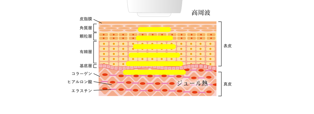 RFタイトニング(高周波治療)は、皮内や皮下組織内を減衰せずに透過し、設定した深度にある組織温度を上昇させます。プラスとマイナスの電気刺激によって細胞がゆれて摩擦熱が発生します。その加熱作用によって血液・リンパ液の流れも促進され、排出作用や組織活性もスムーズに働き循環を整えます。ダメージを与えることで真皮層のコラーゲンも増加させます。しわ・たるみに対して現時点でもっとも有効的な治療方法として高周波治療が活用されています。
